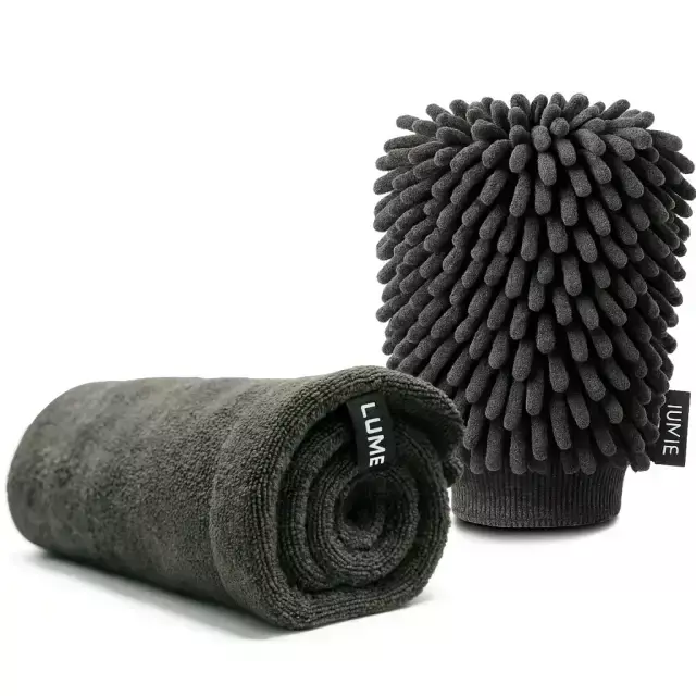 Todo lo que necesitás para un lavado profesional: Un paño premium de secado 50x70cm + guante de microfibra para lavado sin rayones. Resultados dignos de concesionario en tu casa.